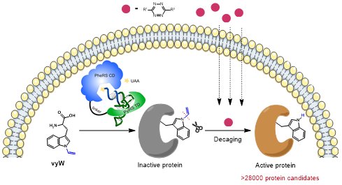 因其独特的结构,色氨酸是蛋白质中介导分子相互作用类型最多、也最“昂贵”的天然氨基酸,其生物合成的“成本”远超其他天然氨基酸,且只由UGG一个密码子编码。由于色氨酸的独特性和稀缺性,色氨酸往往出现在蛋白质的关键位点,稳定蛋白质结构、调节蛋白质构象、调控蛋白质相互作用、参与分子识别和催化等重要过程。如果能够在活细胞内精准操纵特定色氨酸的功能及相互作用,就有望获得一种特异激活含色氨酸蛋白质的通用技术。然而目前尚无对色氨酸进行“可逆化学编辑”的相关报道。该工作发展了一种独特且通用的色氨酸脱笼方法,用于“化学”激活蛋白质特定位点上的色氨酸,以实现相应蛋白质的功能获得性研究。该研究以共轭化学作为设计思路,使用乙烯基作为保护基团,通过共轭吲哚的π系统成功地阻断了色氨酸的几乎所有相互作用类型。这种独特的保护基团可以通过生物正交剪切反应迅速脱除,实现对活细胞内蛋白质的实时、原位激活。更令人兴奋的是,该策略具有广泛的适用性,可以操纵各种不同类型的蛋白质,包括荧光蛋白、金属结合蛋白、激酶、荧光素酶、翻译起始因子和组蛋白翻译后修饰阅读蛋白等。根据计算预测,该策略可以在超过28,000个候选蛋白质上进行生物正交激活调控,展示了其巨大的应用潜力。这一突破为探索和理解蛋白质功能提供了全新的工具。